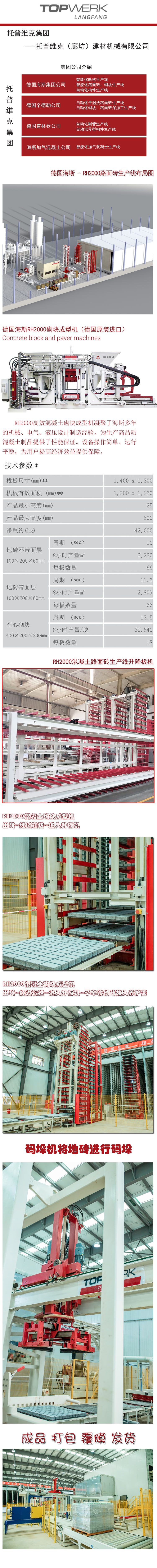 **为可选择其他栈板尺寸托普维克(廊坊)建材机械有限公司是国际混凝土制品成型设备---德国托普维克集团全资子公司,主要生产、销售混凝土砌块地砖生产线、深加工生产线、轨枕生产线、预制件生产线、制管生产线、加气混凝土生产线。德国海斯先进的制造技术、严谨的生产工艺,为中国客户提供了上百条各类混凝土成型生产线设备,在中国市场上享有很高的声誉。