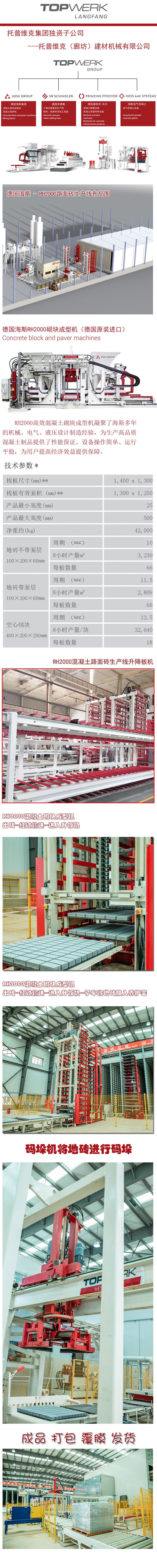海斯RH 2000为全自动通用混凝土成型设备。通过变换模具可生产多种混凝土建筑砌块,如:各种空心砌块、多孔砖、彩色连锁砖、路面板、路缘石、植草砖以及各种用于公园、机场、码头等不同用途的特种混凝土构件。可满足高质量混凝土制品在生产上对现代化机器设备的要求。