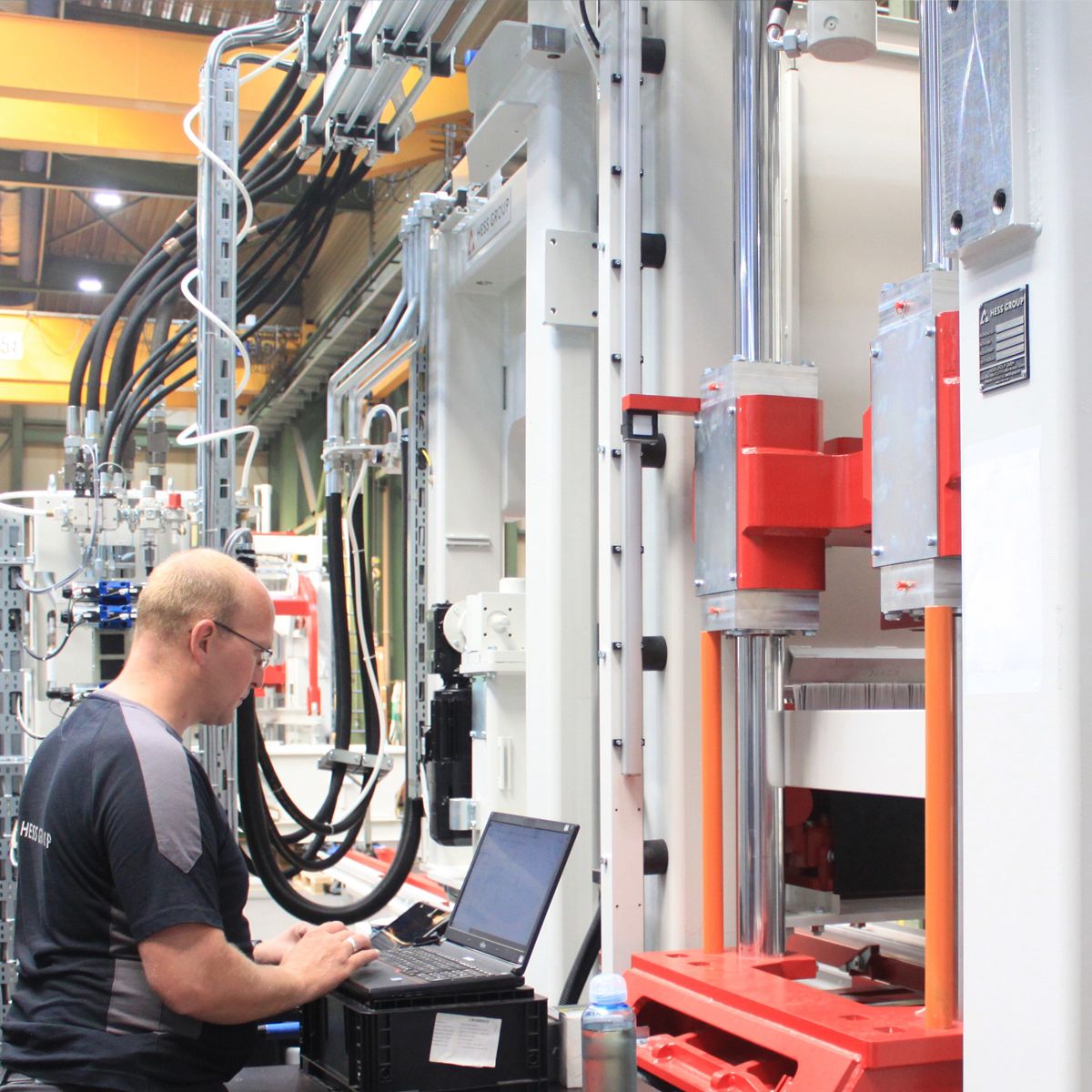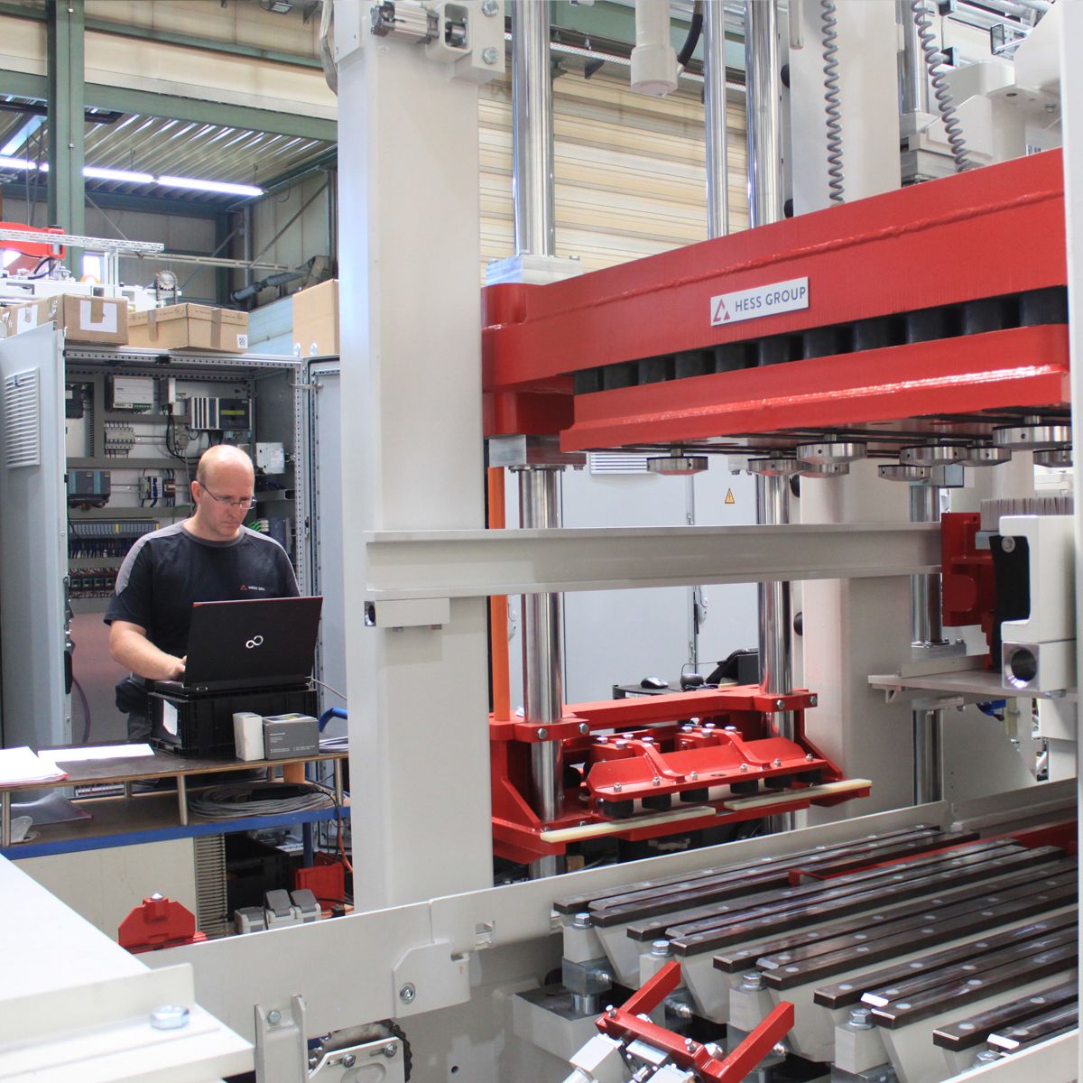 Like any other machine is, this Hess RH 2000-4MVA block machine tested before it is shipped. Hess electrical engineers wire up the electrical panels, and the hydraulic engineers connect the hydraulic power pack. The machine has run in both manual and automatic mode to confirm that the machine is in working conditions. All the main functions are tested shortly before the machine is prepared for shipping. When the machine leaves the factory, we can be sure that not only the mechanical part of the job is done correctly but also the electrical part!